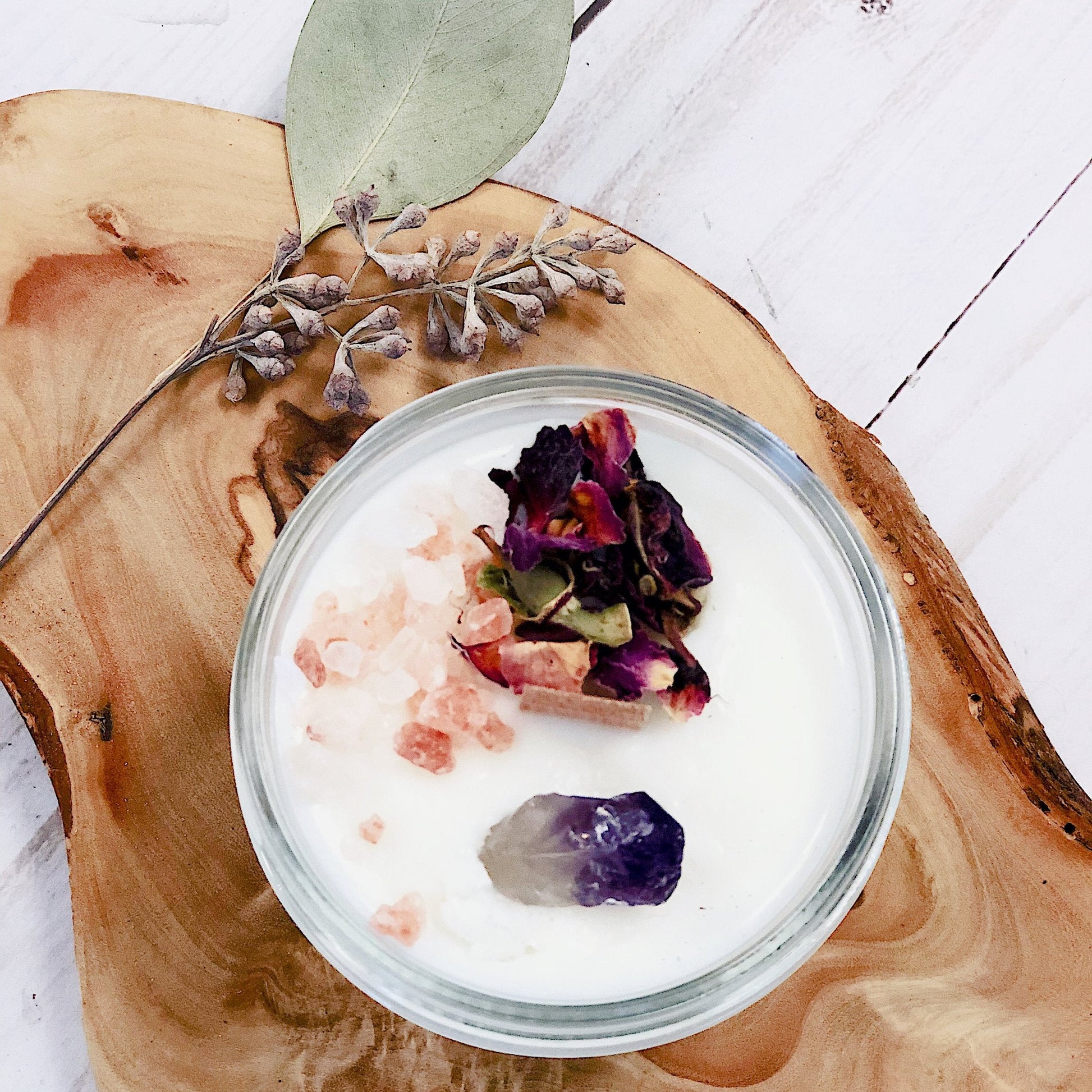 We've topped it with roses for acknowledgement & memory, salt for purity & cleansing and a hand picked and charged piece of amethyst. We chose amethyst as it is the most beneficial to the grieving process. It is said to clear negative energy, protects the grieving person from unwanted entities that can attach themselves during times of grief and releases anger, rage and fear (all normal parts of the grieving process.) It relieves stress and anxiety and rids the body of negative emotions. It's a wonderful support stone. I suggest removing it before lighting and keeping it close to the heart chakra. You may even take it with you and hold it in times of stress.
