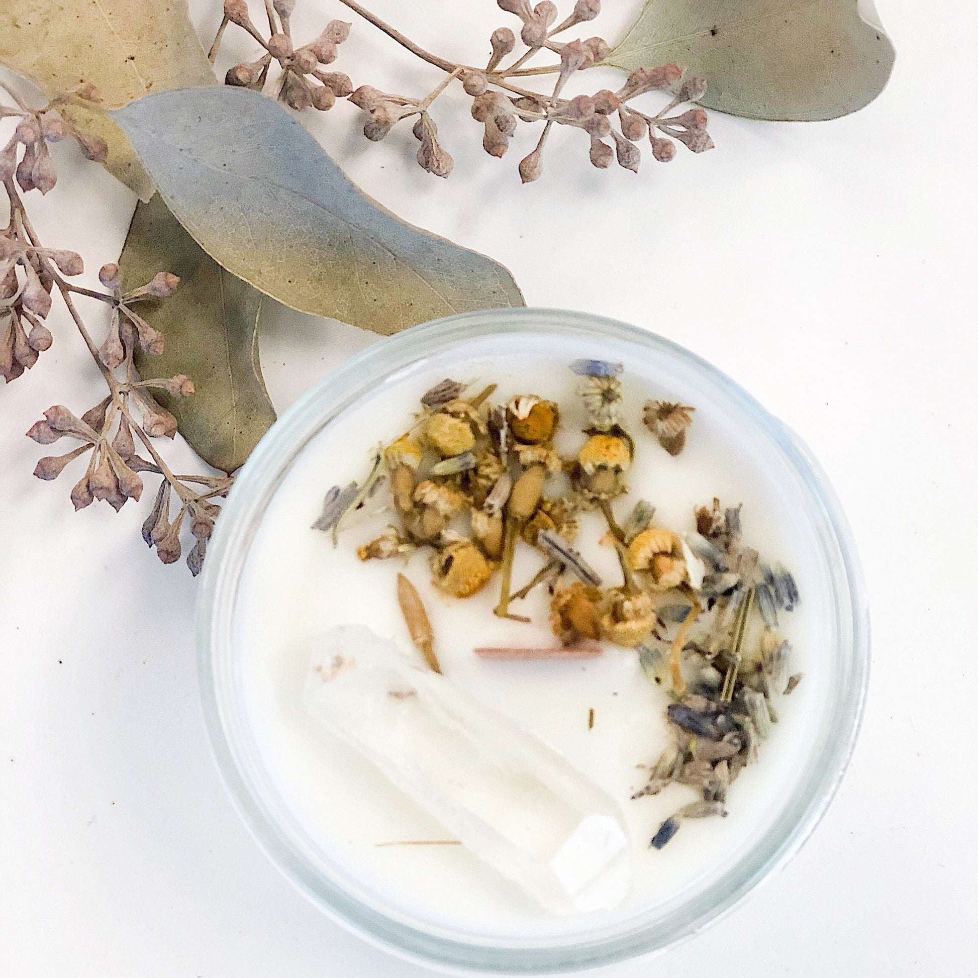 This intention candle is 4 oz of hand-poured soy wax in a glass jar with a metal lid. This candle has a wood wick and is infused with organic essential oils to promote peace and calm. We've topped it with, chamomile for calm, lavender for peace and a handpicked and charged clear quartz crystal. We chose quartz as it clears and absorbs all negative energy, promotes wellbeing and protection. It handles all of the negativity and clears any negative attachments allowing you and your energy to grow and flow freely.